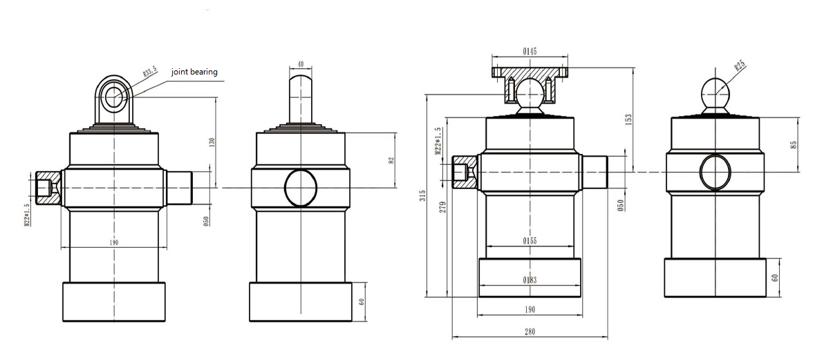 Hydrauliskcylinder til tipvogn, borediameter 110 mm, eller 120 mm, eller 130 mm, eller 150 mm, slaglængde 750 mm eller 800 mm, arbejdstryk 16 MPa, olieport størrelse M22*1,5