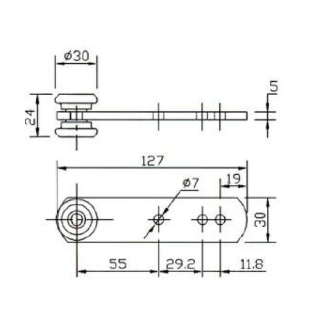 Rodillo con rueda de nailon de 30 mm de diámetro, longitud total 127 mm, acero cincado