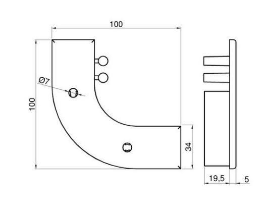 Tutup sudut PVC dengan pin untuk profil aluminium, ukuran garis 100mm*100mm, lebar 34mm, tinggi bagian masukkan 19.5mm