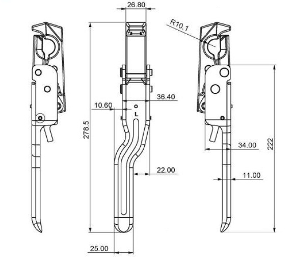 Lastebilskjenklås med forskjøvet håndtak venstre, total lengde 278,5 mm, stål med rå finish