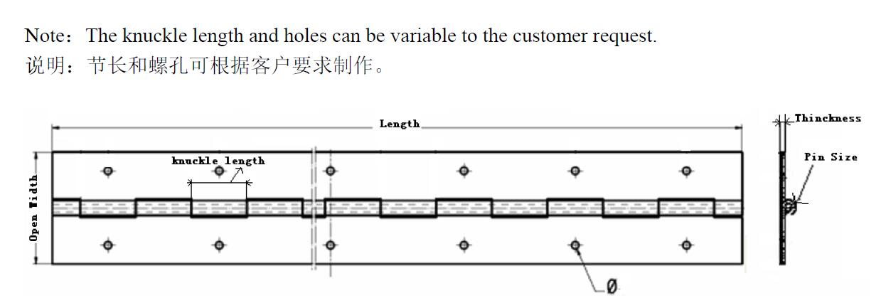 o dobradiça contínuaé amplamente utilizado para vários veículos e outras aplicações industriais. Podemos personalizardobradiça contínuas de diferentes comprimentos, larguras e espessuras de chapa de acordo com as diferentes necessidades de nossos clientes, com chapa galvanizada ou chapa de aço inoxidável como opções de material. Nosso produto é confiável em qualidade, boa aparência e preço competitivo.