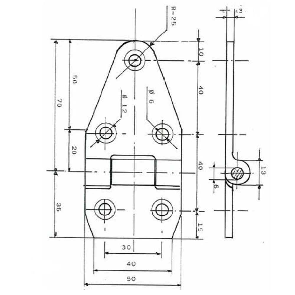 Butt hinge with 5 holes, open length 105mm, width 50mm, thickness 3.5mm,