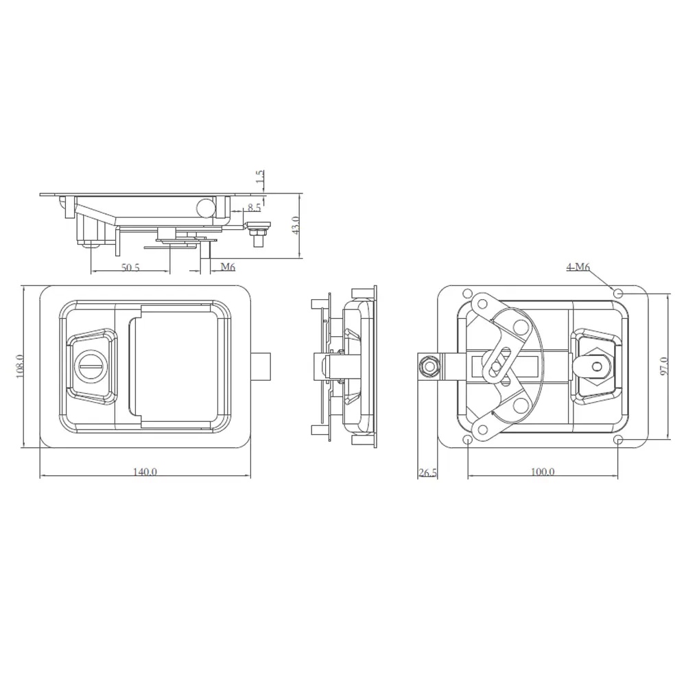 Stainless steel paddle lock 140*108, polished stainless steel 304 lock tray with zinc alloy lock tongue, lock cylinder on tray, with 3 locking points
